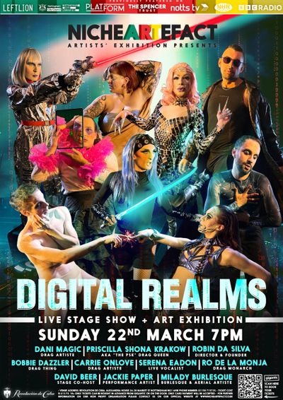 The "DIGITAL REALMS" Exhibit will be the Thirteenth Showcase from Niche Artefact. Diving deep into the themes of technology and the future, the show is located at Revolution de Cuba, Alexandra House 26-28 Market St Nottingham NG1 6HW 01158 715735. This unique glamorous art event with a full live main stage show will begin at 7PM on Sunday 22nd March 2026. You will be able to mingle with all the live performers and local artists that will be revealing one of a kind, never before seen pieces of artwork and enjoy a varied evening of live entertainment.